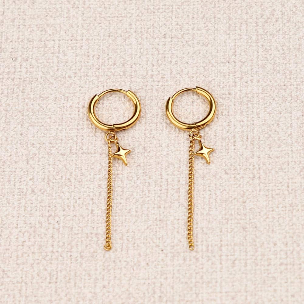 Eryel earrings in stainless steel, dangling with a 1cm-diameter mini creole. Has a fine chain and a star charm.
