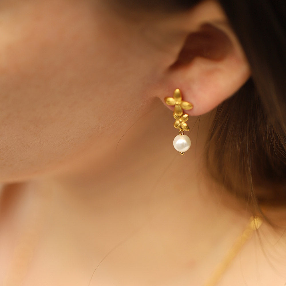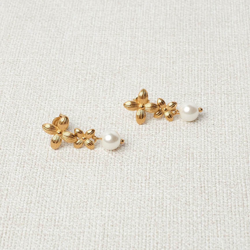 Jacynthe earrings in stainless steel, floral motif chips with a small freshwater pearl pendant.