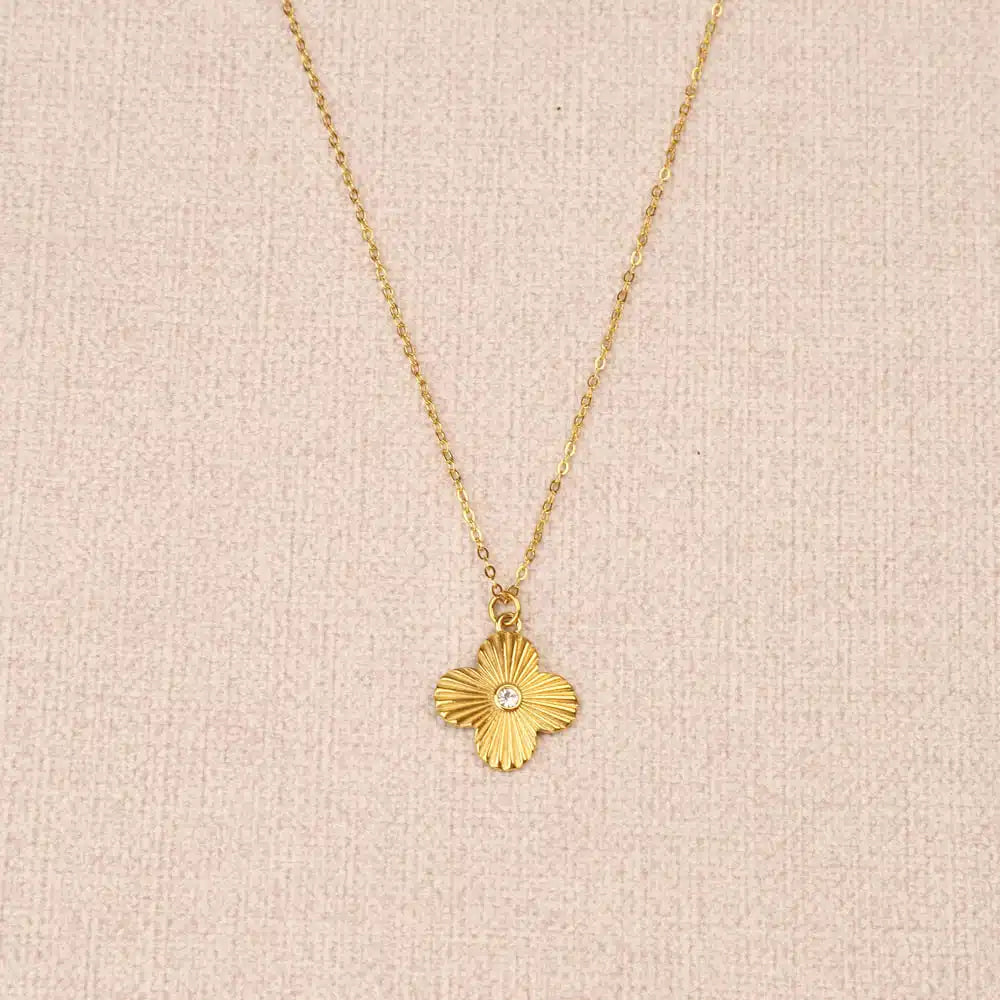 Manava necklace in stainless steel, single fine chain with striated clover pendant adorned with white rhinestone.