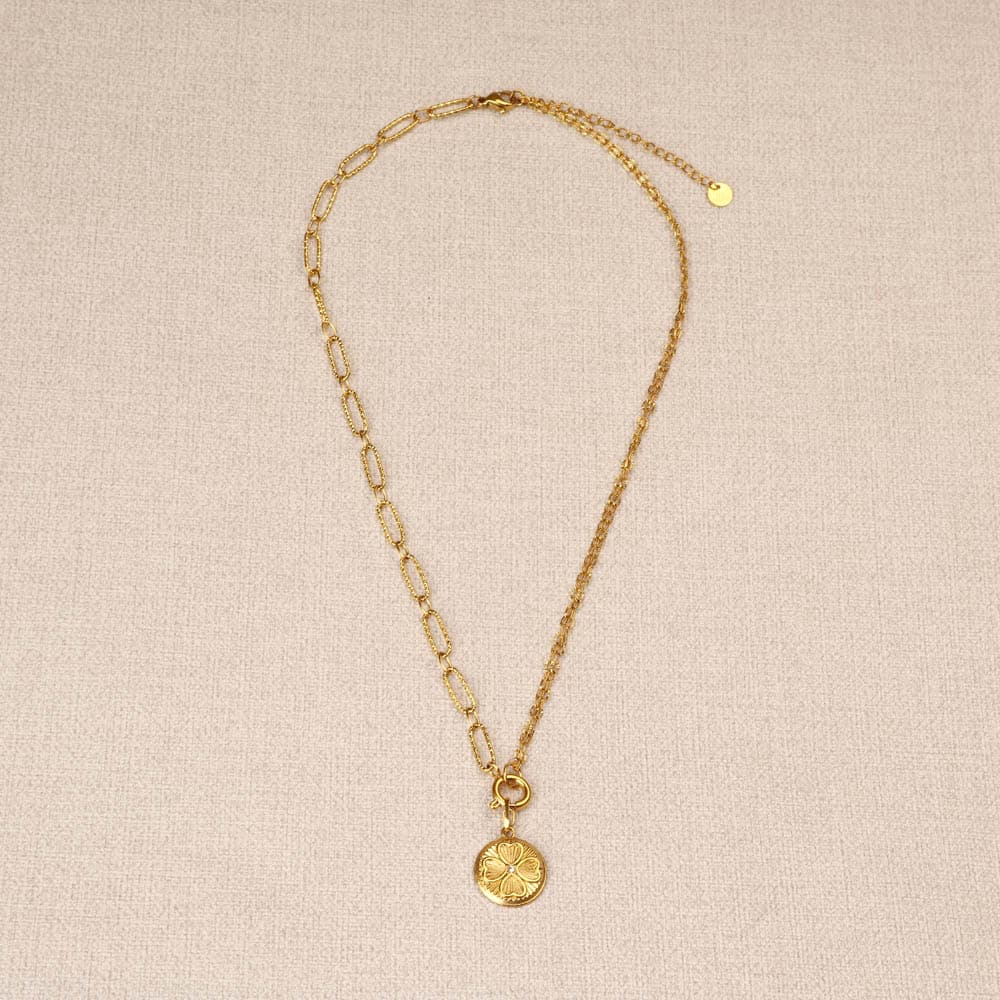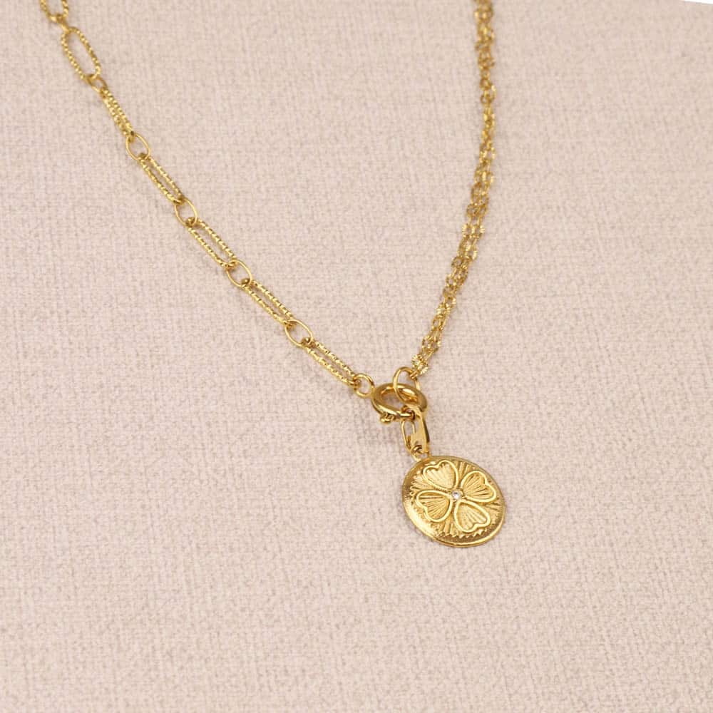 Auralie Clover Half Clip Necklace, combining 2 different types of chain and linked by a medallion with a cloverleaf motif and central white rhinestone. Ring clasp for easy addition of pendants.