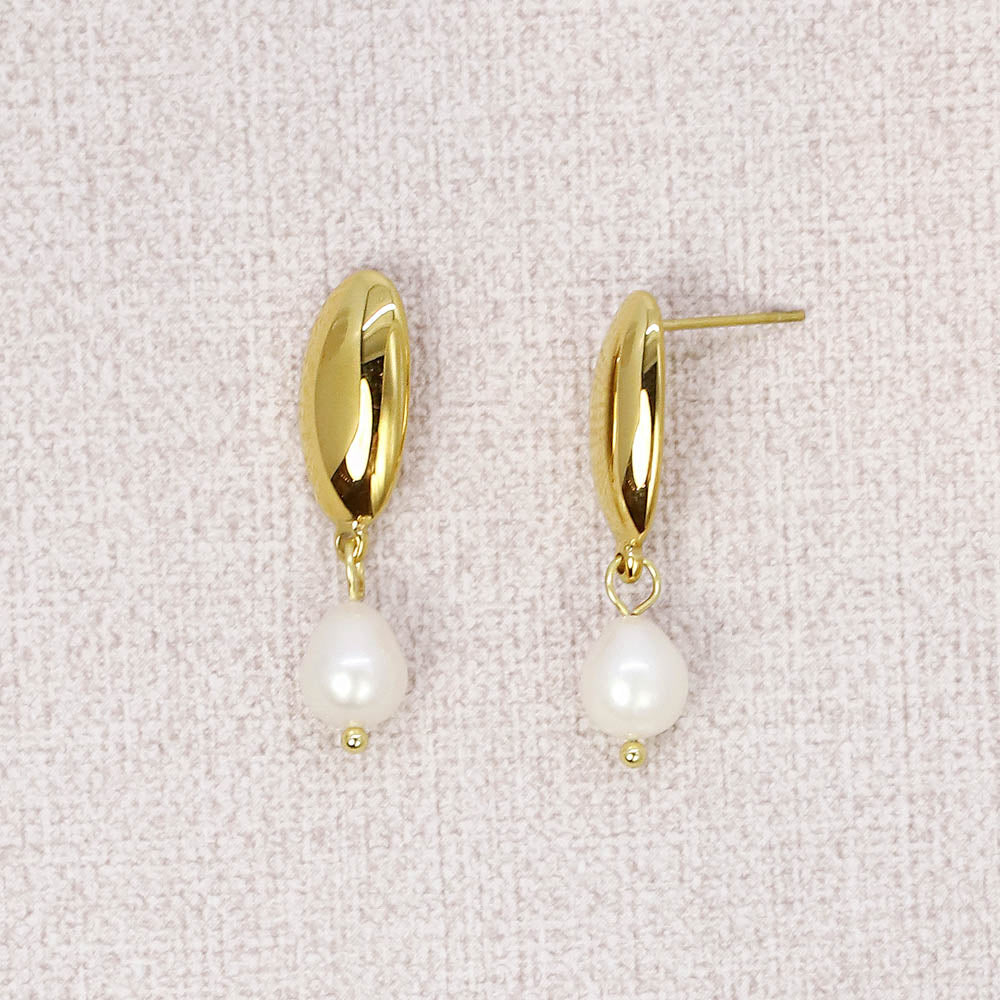 Sadile earrings in stainless steel, dangling from a streamlined oval base, adorned with a natural freshwater pearl.